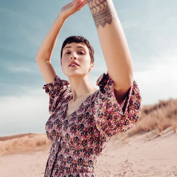La mannequin mesure 175cm et porte une taille S.
